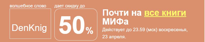 = Рекомендуем: "Лучшие книги по мнению читателей". по 24 апреля 2023, 18+ = Промокод SKQ22BRY — скидка 10 % на специальную подборку 18+ = Скидки дня — до 50% на специальную подборку 18+ =Читай больше — плати меньше! 18+ После каждой покупки на Букривер, вы можете в течении 24 часов приобрести со скидкой 30% любую книгу из этого раздела. Ваш таймер будет обновляться с каждой новой покупкой. = Спец подборка книг до 30% 18+